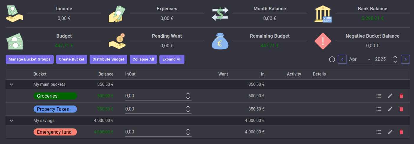 Putting money in and out from buckets happens in OpenBudgeteer in an automated way, but can be also done manually. This will be explained over the next sections.