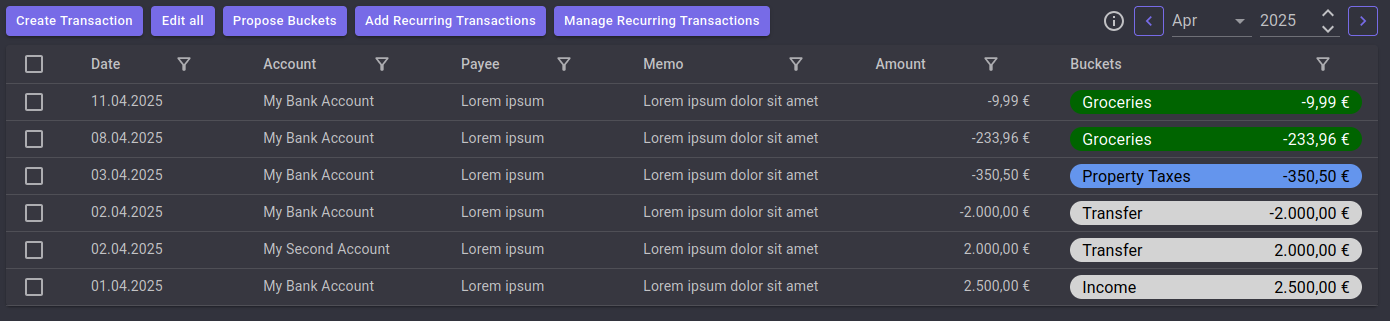 Transactions which represent your (monthly) income can be assigned to the pre-defined Income Bucket. If you have transferred money from one Account to another, you can use the Transfer Bucket. Please ensure that all Transfer Transactions have in total a 0 Balance to prevent data inconsistency and wrong calculations.