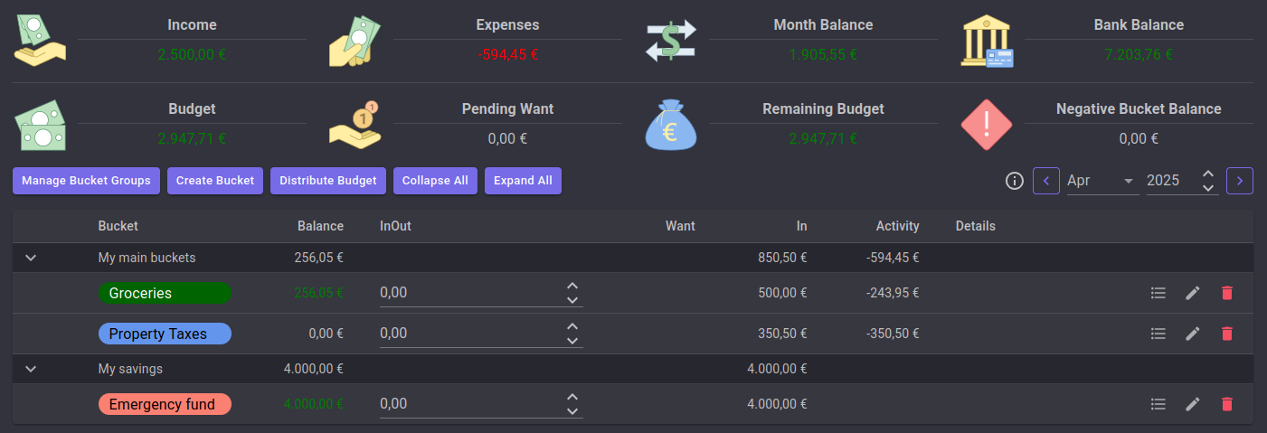 Once all Transactions are assigned properly, you can go back to the Bucket Overview to see if your Budget management is still fine or if you need to do some movements. You should always ensure that your Buckets don't have a negative Balance. Also your Remaining Budget should never be negative.