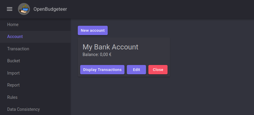 The best way to start with OpenBudgeteer is to create at least one bank account on the Account Page. There is not much to configure here, just enter a name and that's it.
