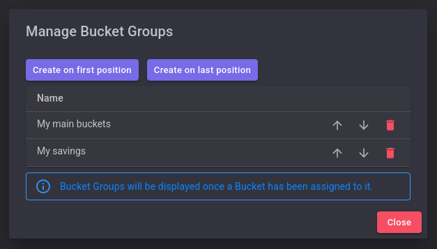 Now that there is some grouping availabe, you can start cerating your first Buckets. If you don't know which one you need, maybe start with some Buckets for your monthly or even yearly expenses like Car Insurance, Property Taxes, Instalments etc. and Buckets for your regular needs like Groceries or Gas. You can also create a Bucket for your next big trip by putting some money into it every month.